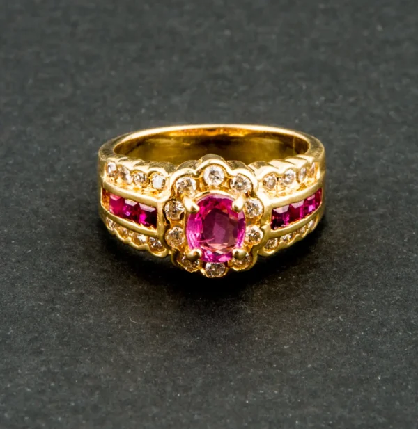Sortija de oro amarillo con rubíes y brillantes.