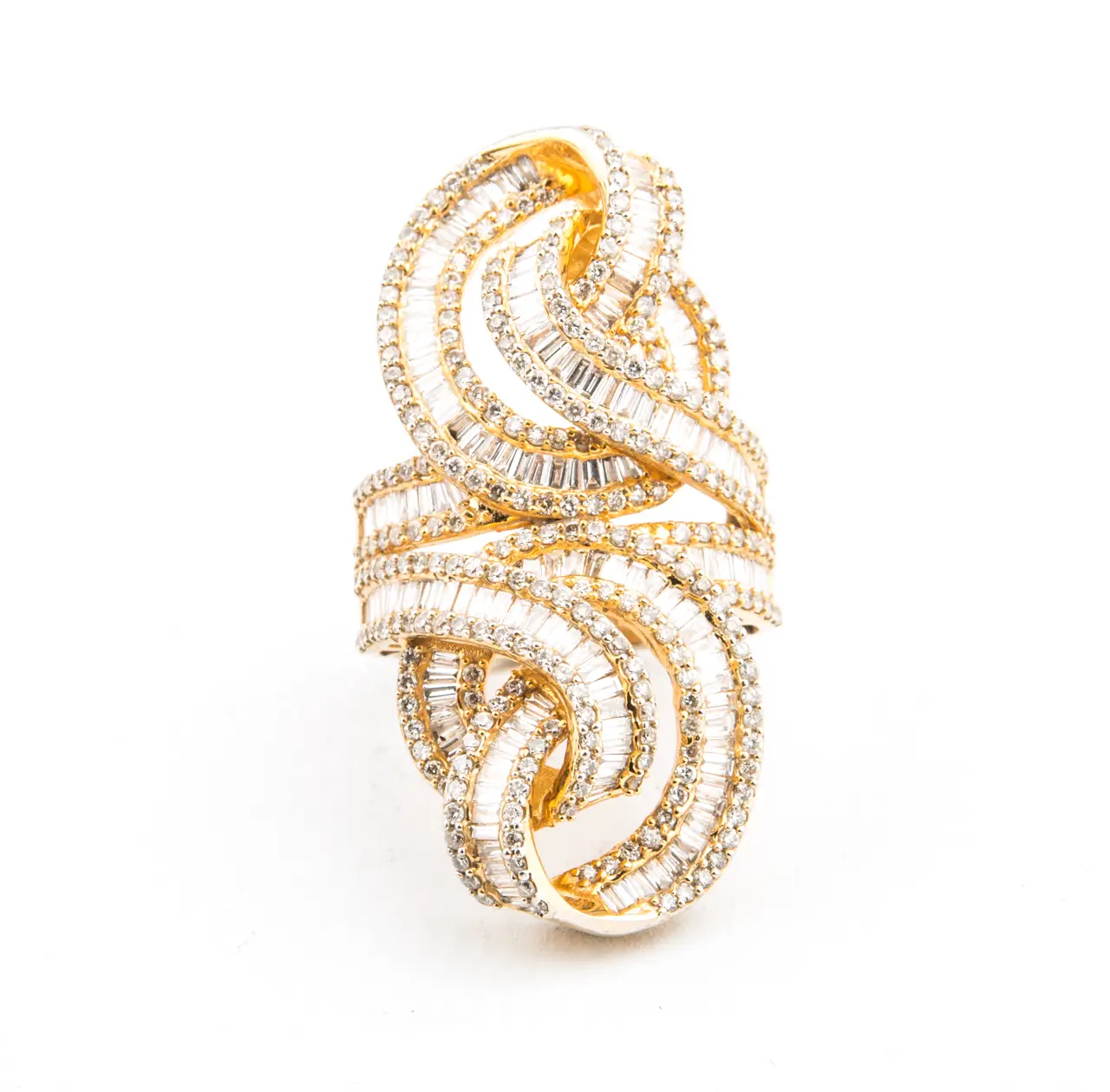 Sortija de oro amarillo lanzadera con brillantes talla baguette y redonda