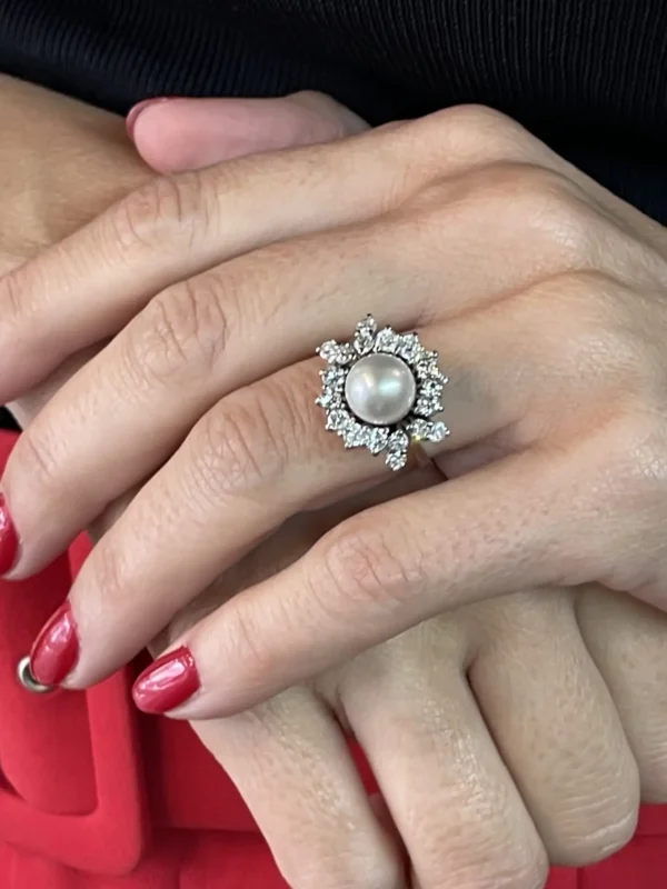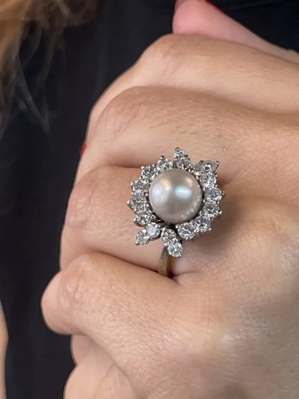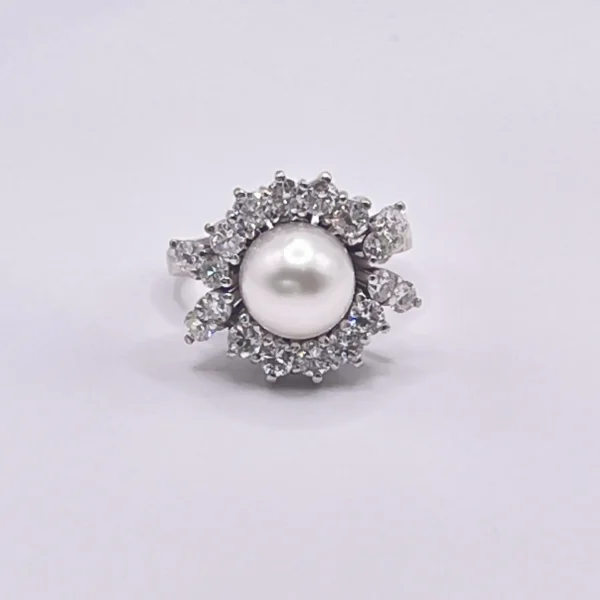 Sortija antigua de oro blanco de 18 quilates perla Australiana central y orla de diamantes.