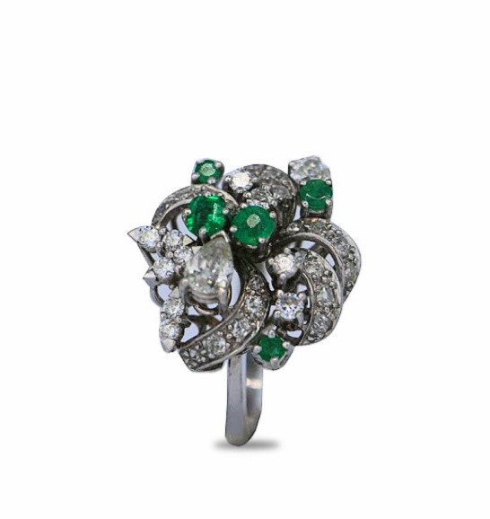Sortija flor en oro blanco con diamantes y esmeraldas.