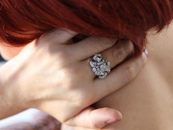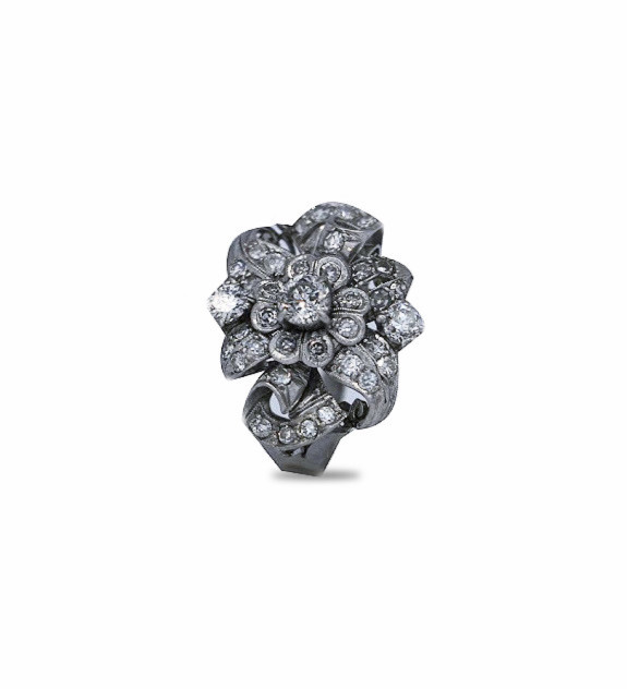 Sortija flor en oro blanco con diamantes.