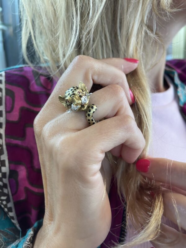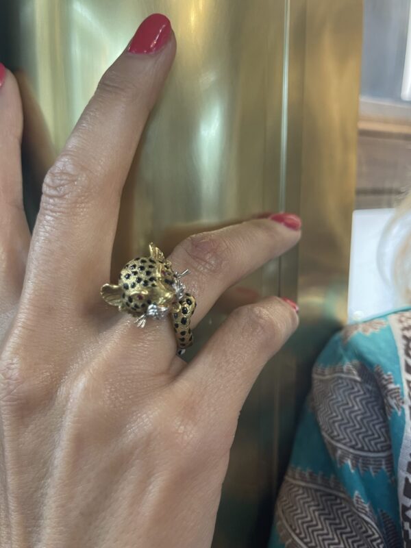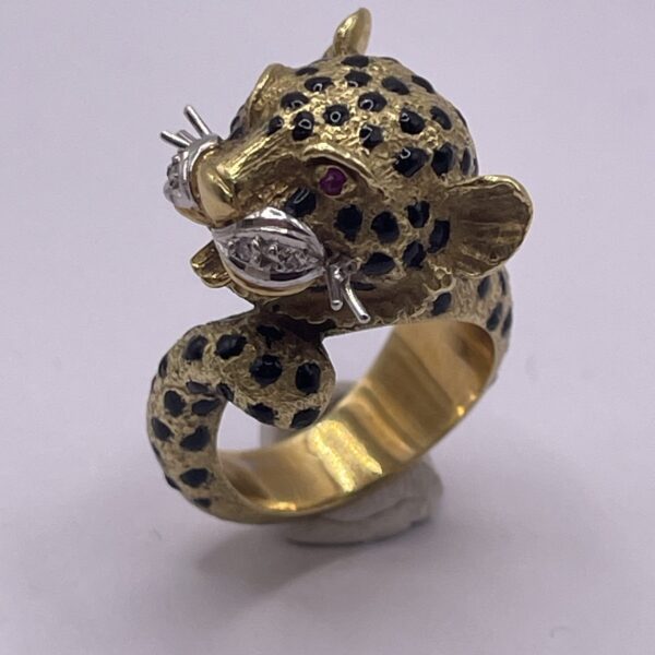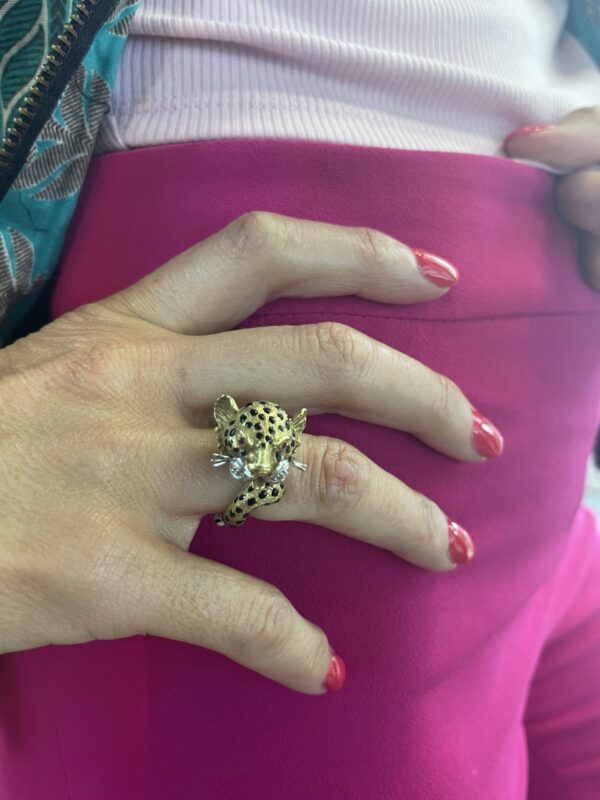 Sortija de leopardo vintage en oro 18kts con cuatro diamantes en sus bigotes y en los ojos dos rubí tallados. Es de los años 60 y su maravilloso diseño hace que sea una joya única.