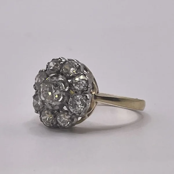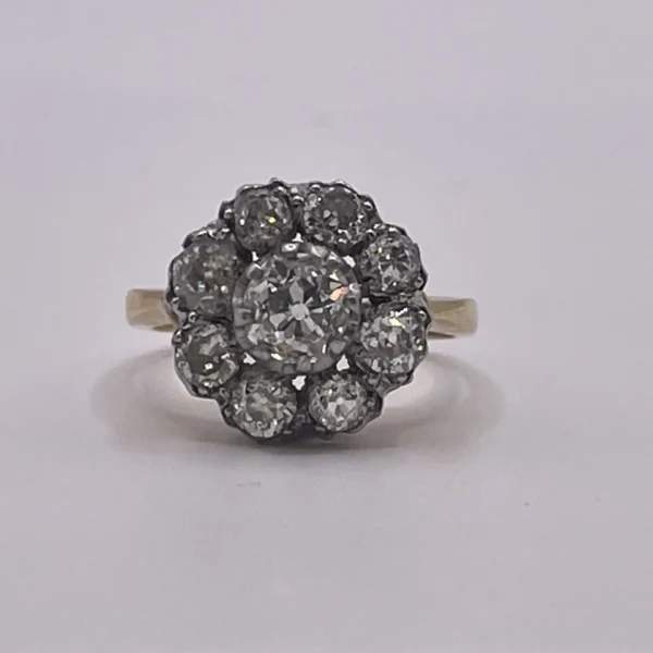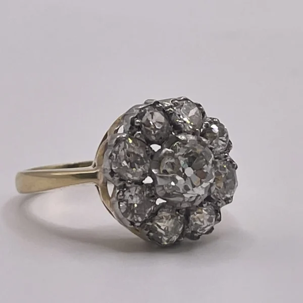Sortija antigua realizada en oro de 18 quilates, compuesta por un rosetón de ocho diamantes de 0,20ct y uno central de 0,50ct en talla antigua.