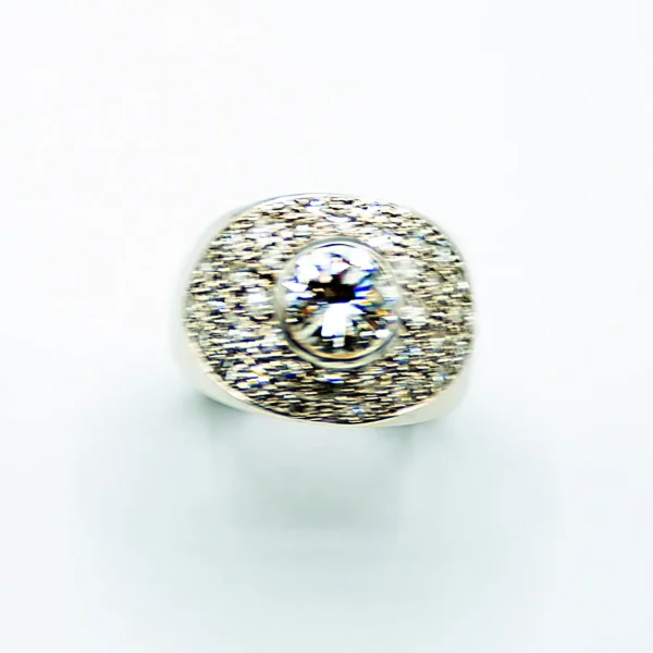 Sortijas con diamantes central de 1.85 cts con pavé alrededor en oro blanco.